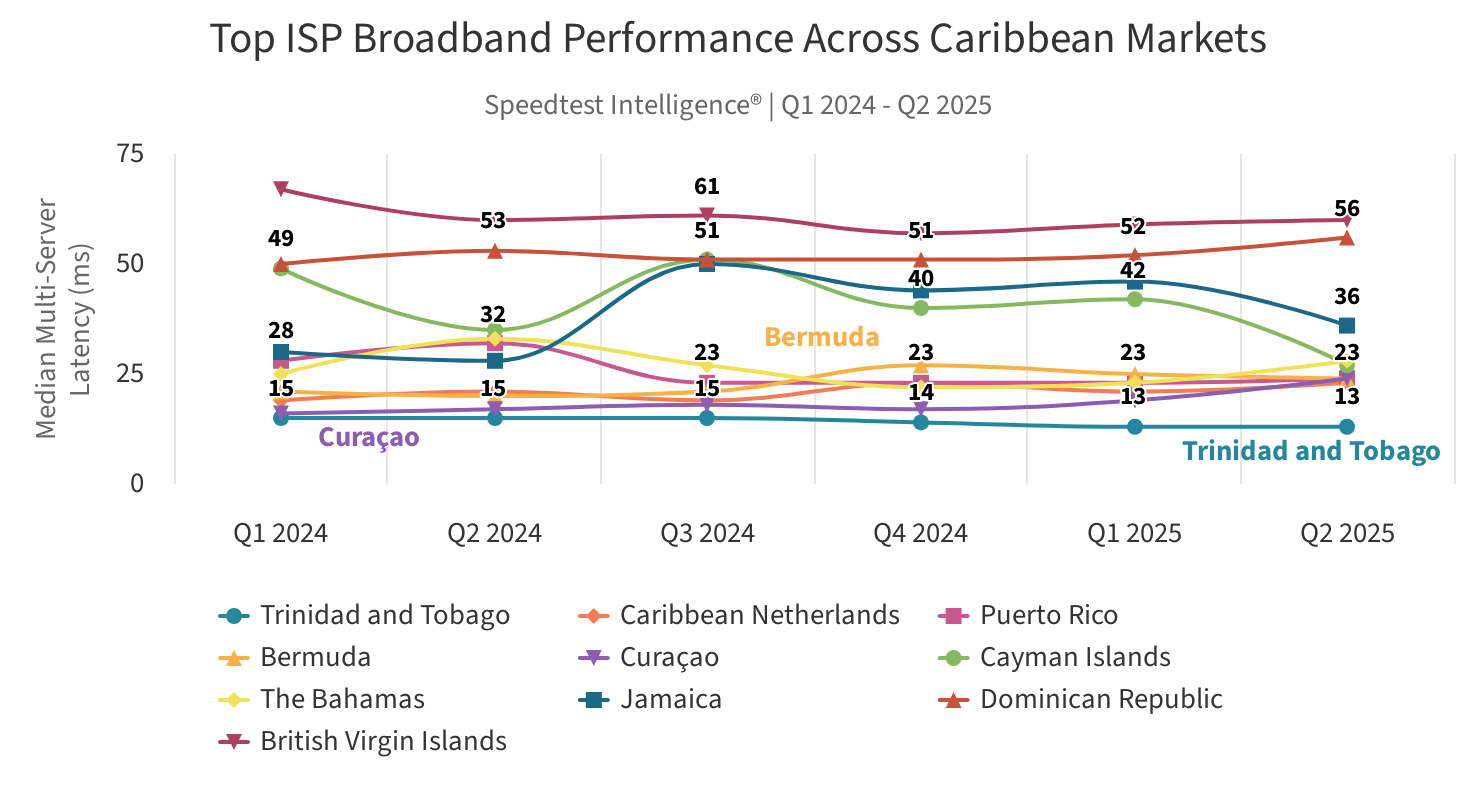En este parámetro,destacan Trinidad y Tobago con 86.3% de consistencia en una escala de 100,Bermudas (86.1%) y Puerto Rico (85.5%). Según Ookla,esto significa que brindan “un servicio de primera clase a más del 85% de los usuarios”.