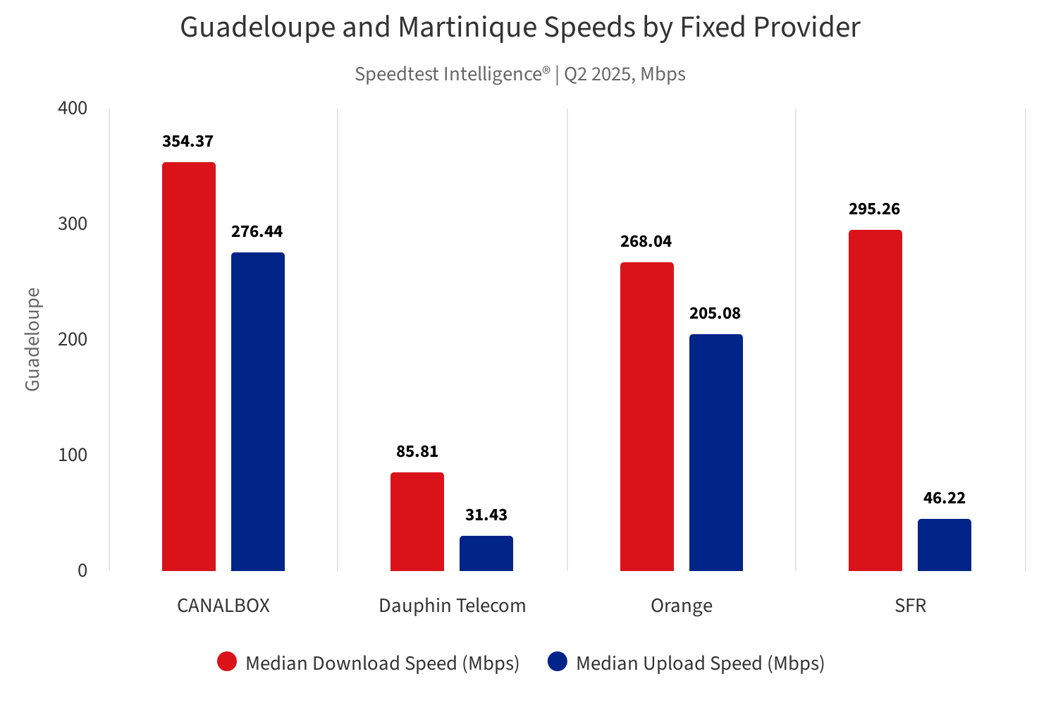 Por ejemplo,en Guadalupe,el proveedor de acceso a Internet CANALBOX ofrece velocidades de descarga promedio de 354.37 Mbps y de carga de 276.44 Mbps. Y en Martinica,SFR lidera con velocidades de descarga de 263.1 Mbps y de subida de 180.40 Mbps. Ambos ofrecen banda ancha de fibra.