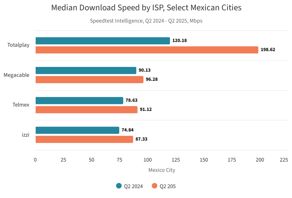 Particularmente,en las grandes ciudades del país se observa que los usuarios están disfrutando de conexiones más veloces. Por ejemplo,en la Ciudad de México: Totalplay es el líder del mercado con una velocidad de descarga media de 198.62 Mbps,mientras que en el segundo trimestre de un año atrás ofrecía 120.18 Mbps.