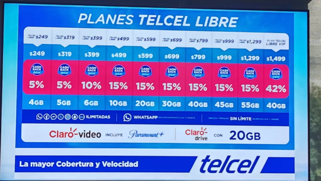 Los Planes Libres de Telcel inician en249 pesos mensuales con 4GB,redes sociales,llamadas y SMS ilimitados,con un cashback mensual de 5 por ciento. El más caro cuesta mil 499 pesos con 40 GB,mensajes,llamadas y redes ilimitadas,y un cashback de 42 por ciento.