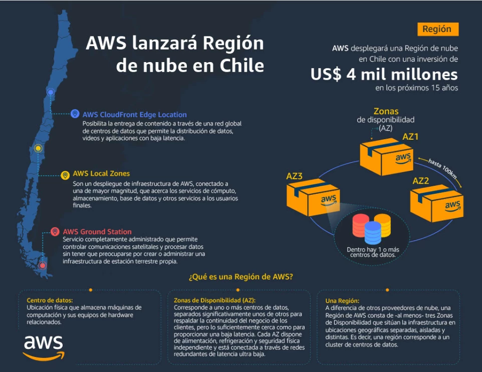 Amazon Web Services (AWS) anunció la apertura de una nueva Región de Infraestructura de Nube en Chile: estará disponible en 2026. La compañía prometió inversiones por 4 mil millones de dólares en los próximos 15 años para la construcción,conexión,operación y mantenimiento de sus Centros de Datos en el país.